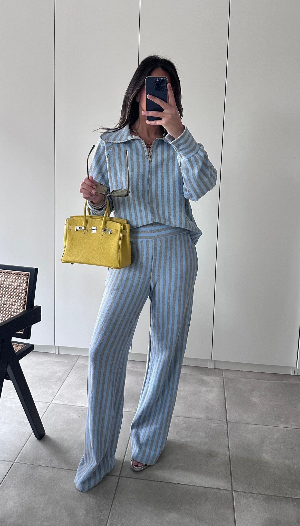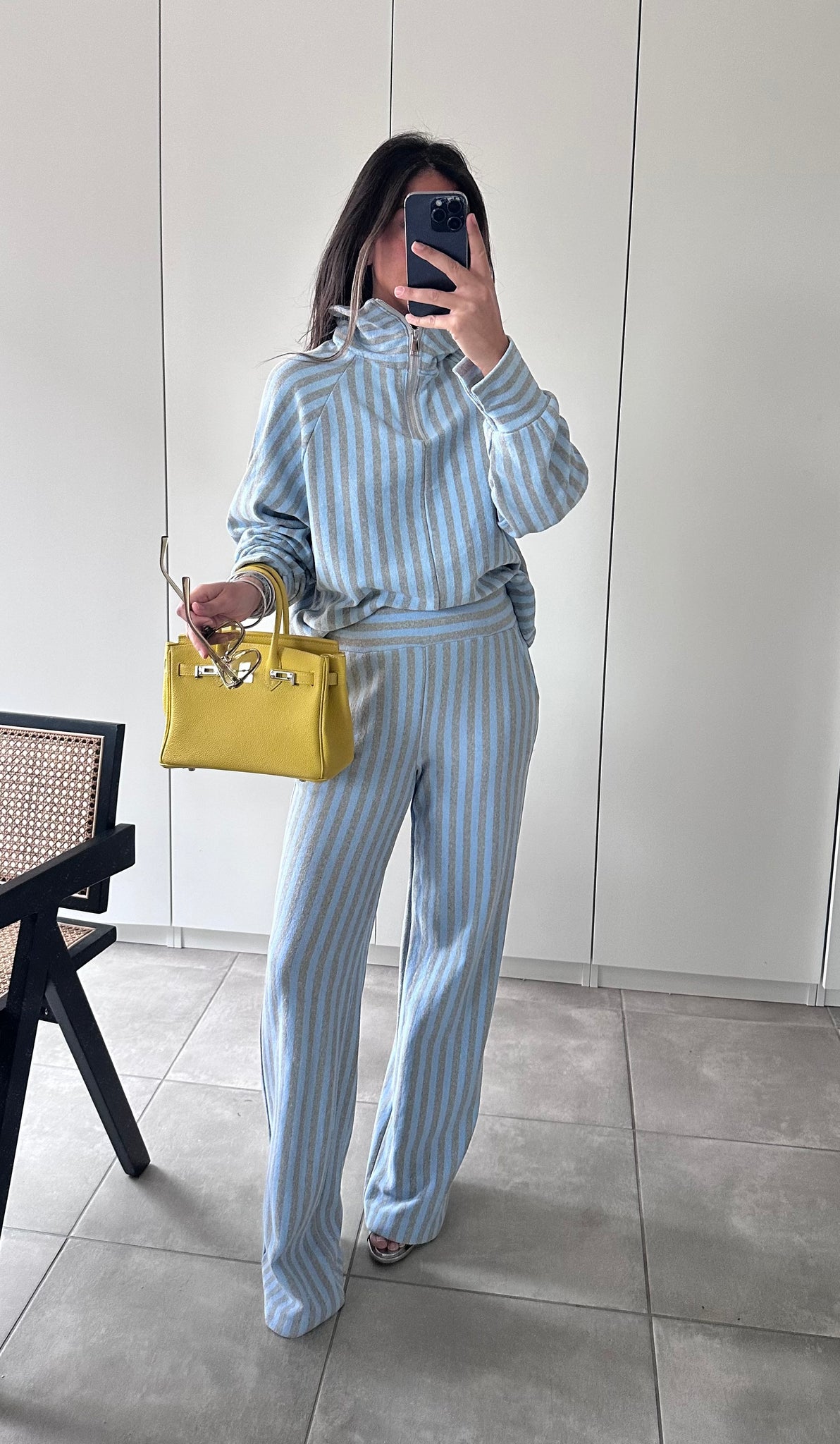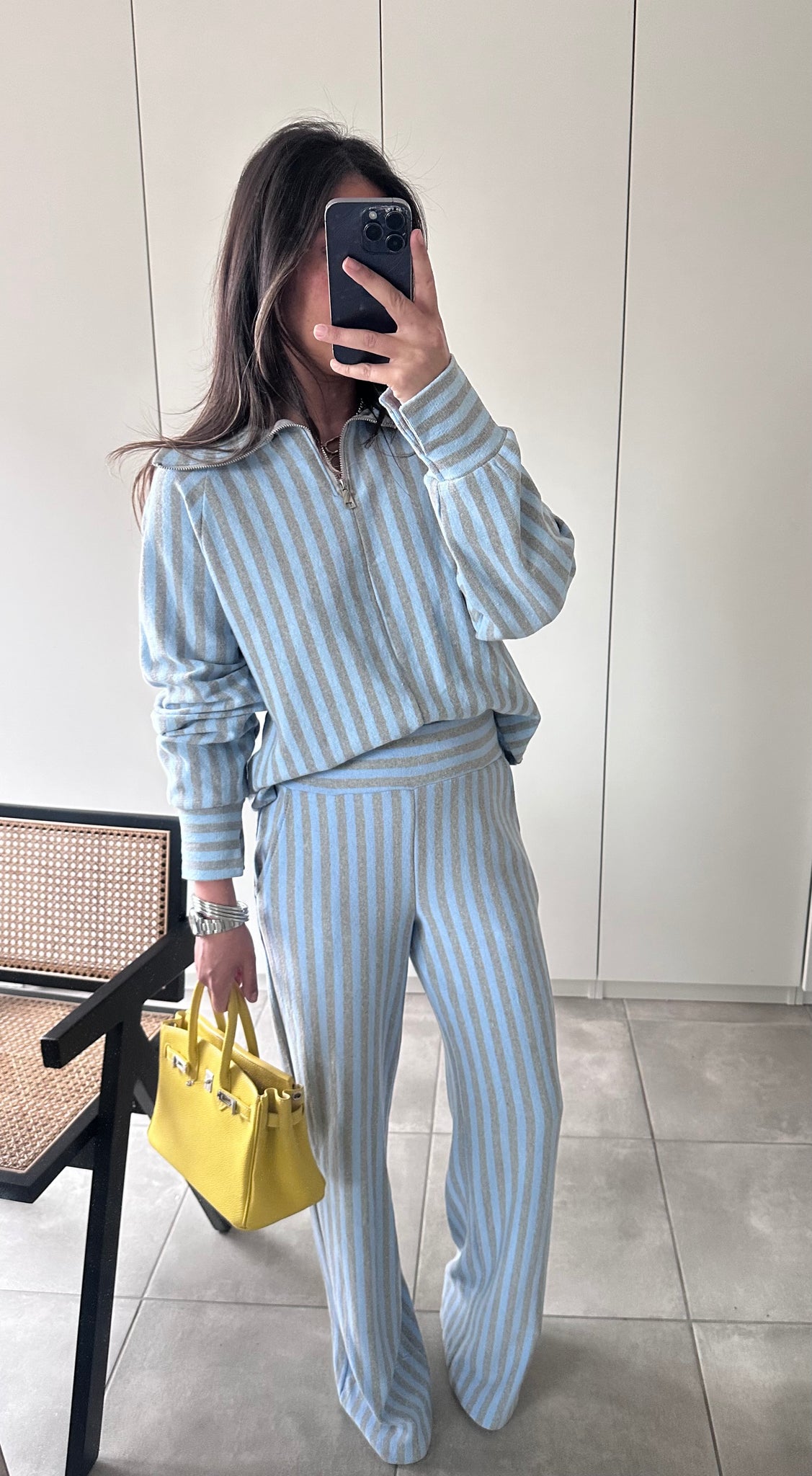 Ensemble rayures bleu et gris  pantalon taille haute à poches et polo manches longue col haut à  fermeture argenté