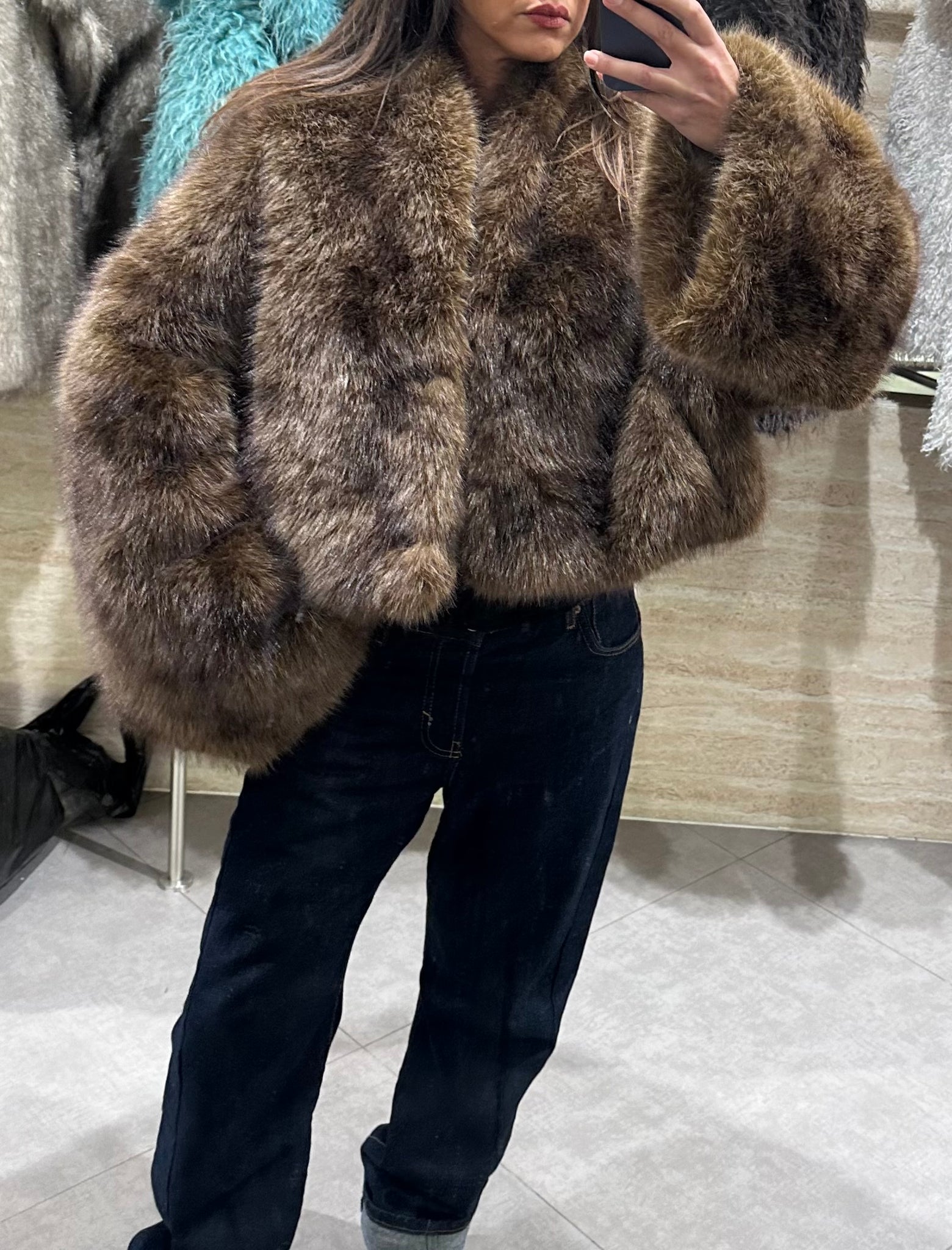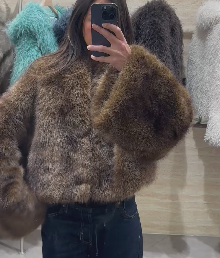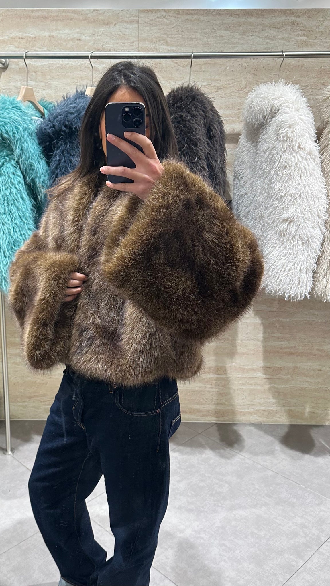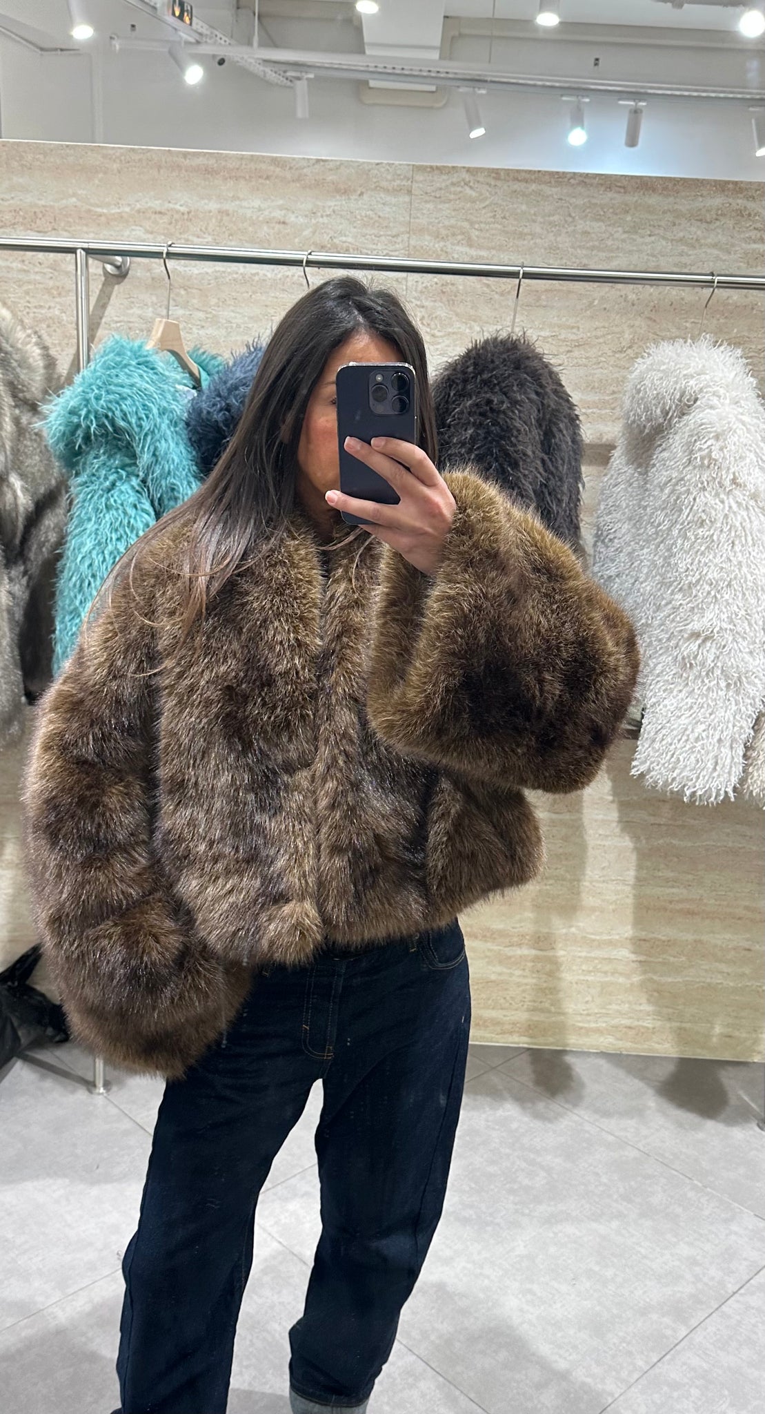 Manteau oversize en fourrure végane marron beige se ferme avec bouton pression invisible, manches larges et poches