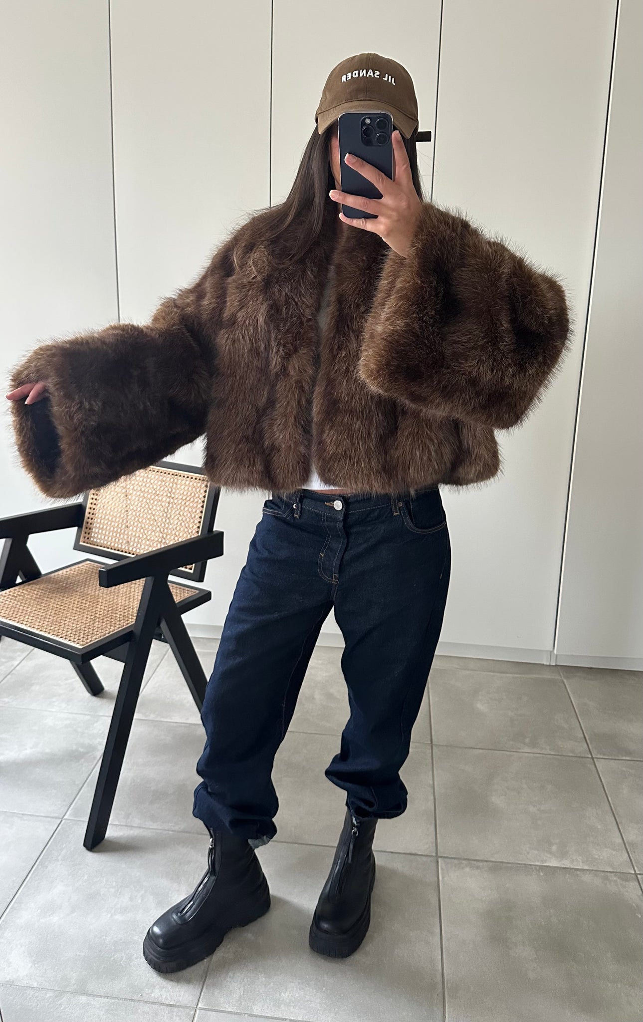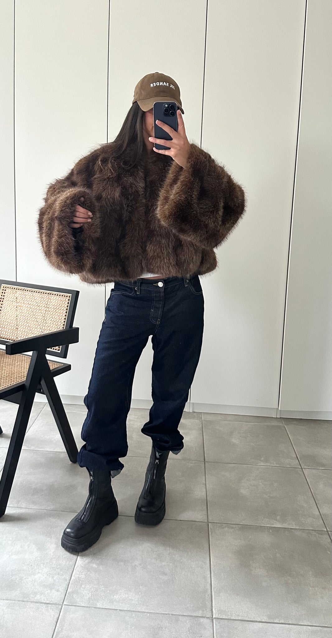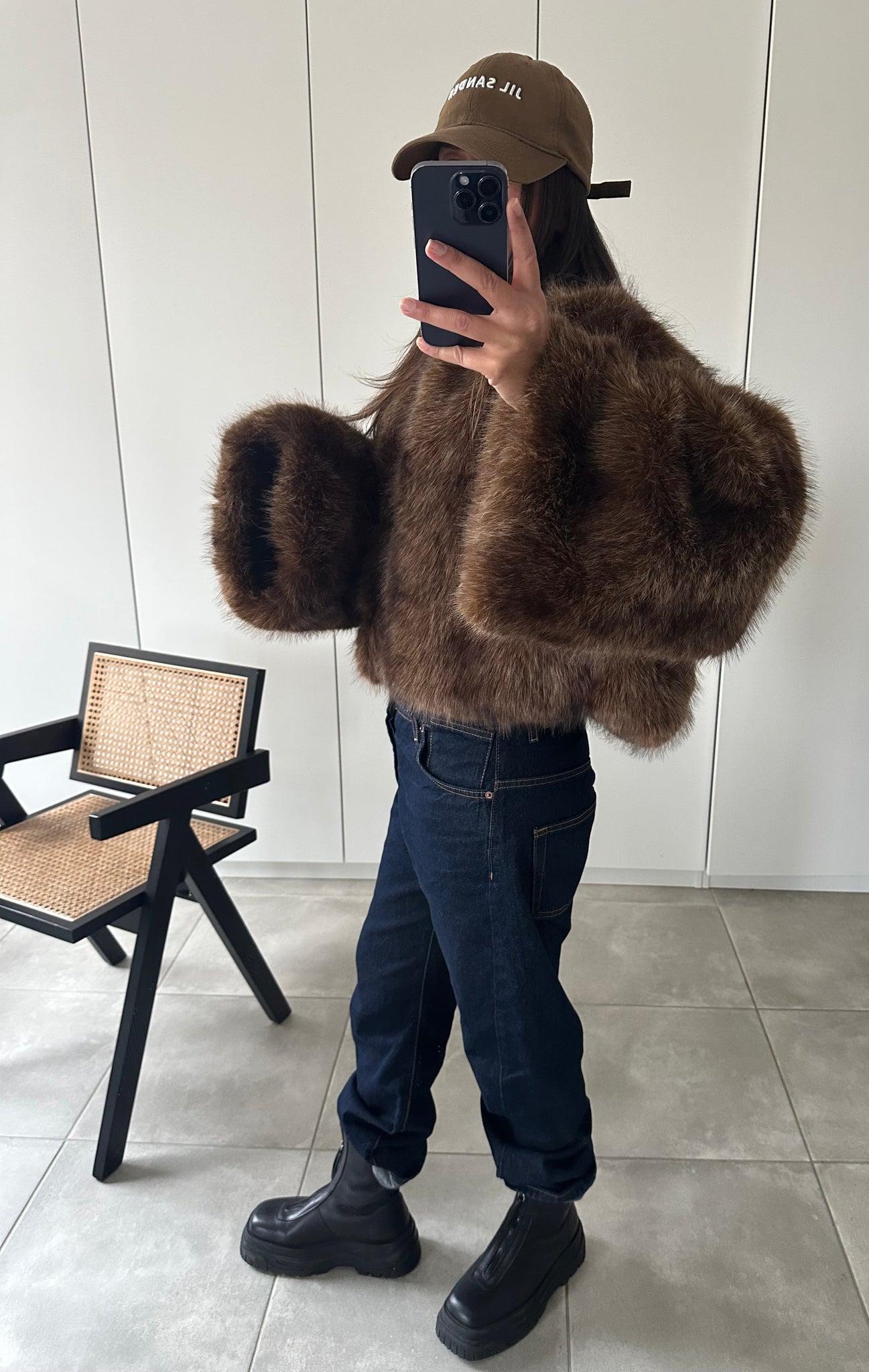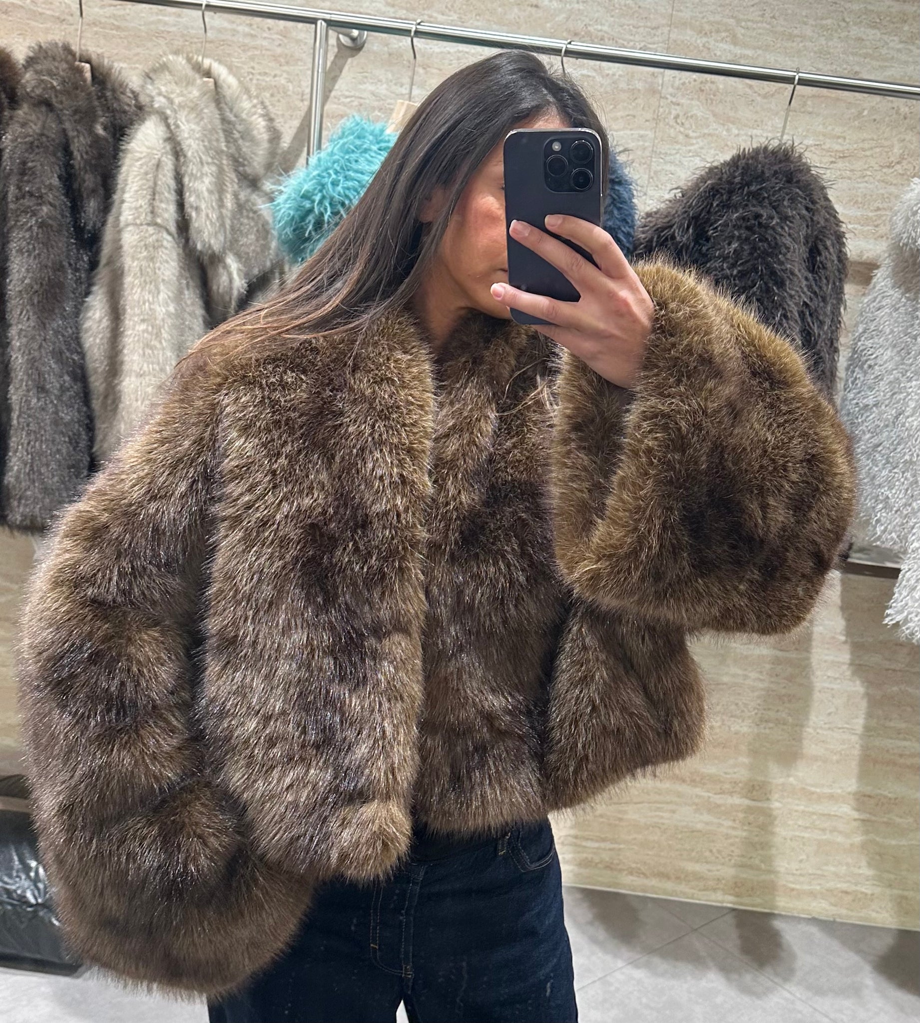 Manteau oversize en fourrure végane marron beige se ferme avec bouton pression invisible, manches larges et poches