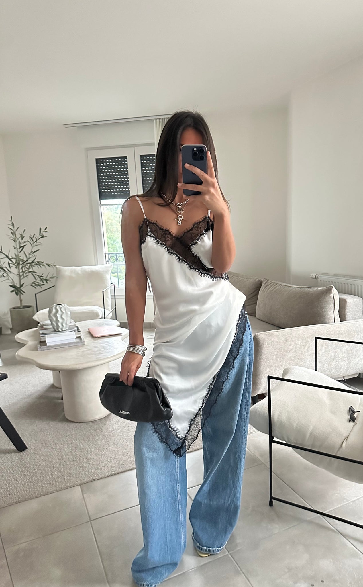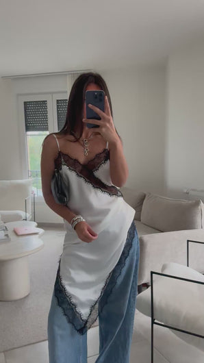 Robe bordures dentelles fendu asymétrique fluide en satin blanche bretelles réglables